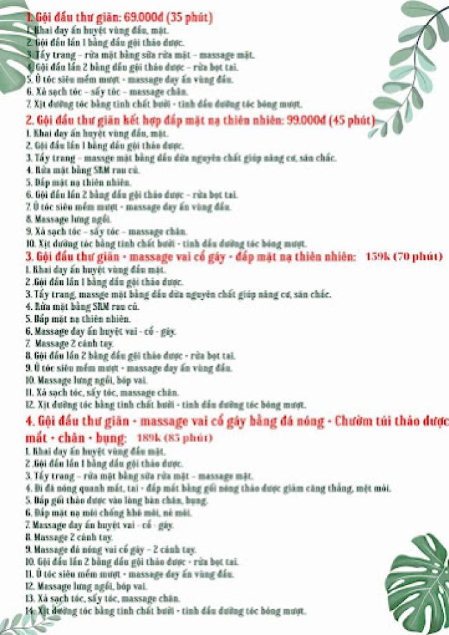 - Gội đầu dưỡng sinh:là chăm sóc tóc và da đầu một cách đặc biệt, kết hợp với việc massage vùng đầu, vai gáy, cổ, lưng,…làm sạch da đầu và tóc với các dầu gội thảo dược từ thiên nhiên như sả, bồ kết, vỏ bưởi, quế,…